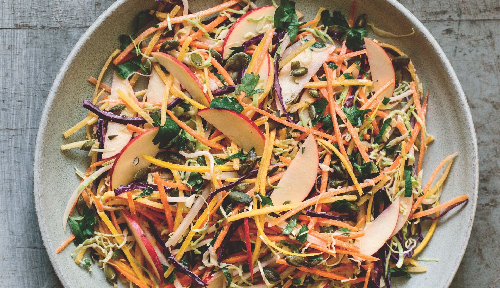 - Rettich und Karotten schälen und raspeln oder in streichholzdünne Stifte (Julienne) schneiden. Die Kohlsorten von welken Blättern befreien und fein schneiden oder hobeln. Die Äpfel ohne Kernghäuse in feine Spalten schneiden. Die Petersilienblättchen abzupfen und hacken.