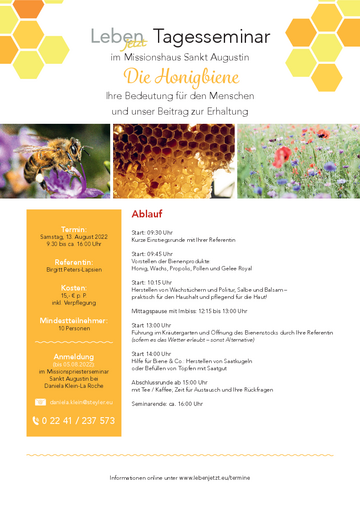 Tagesseminar im Missionshaus Sankt Augustin Die Honigbiene Ihre Bedeutung für den Menschen und unser Beitrag zur Erhaltung Ablauf Termin: Start: 09:30 Uhr Kurze Einstiegsrunde mit Ihrer Referentin Samstag, 13. August 2022 9:30 bis ca. 16:00 Uhr…