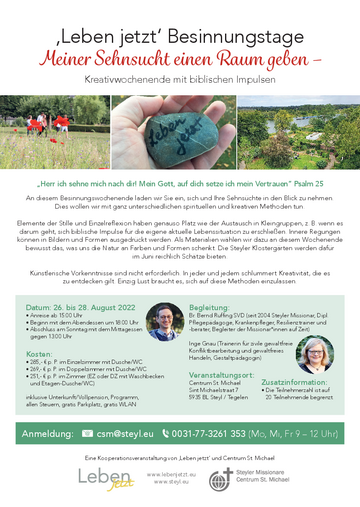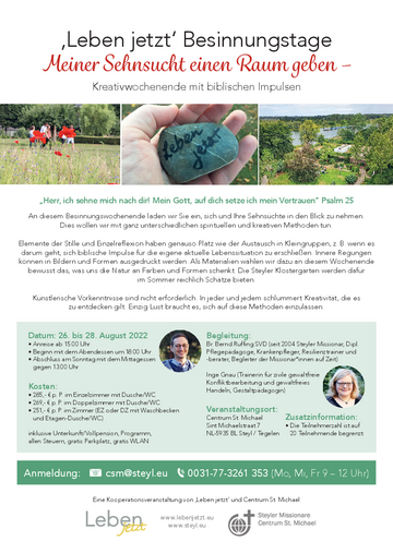 ‚Leben jetzt‘ Besinnungstage Meiner Sehnsucht einen Raum geben – Kreativwochenende mit biblischen Impulsen „Herr, ich sehne mich nach dir! Mein Gott, auf dich setze ich mein Vertrauen“ Psalm 25 An diesem Besinnungswochenende laden wir Sie ein, sich…