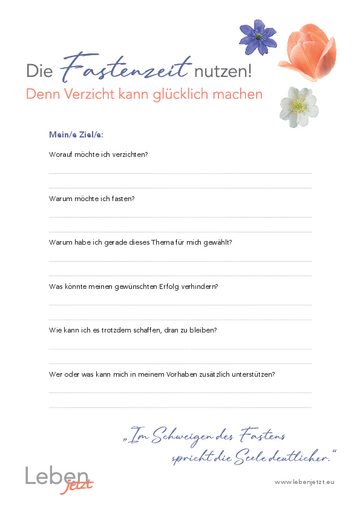Mein/e Ziel/e: Worauf möchte ich verzichten? Warum möchte ich fasten? Warum habe ich gerade dieses Thema für mich gewählt? Was könnte meinen gewünschten Erfolg verhindern? Wie kann ich es trotzdem schaffen, dran zu bleiben? Wer oder was kann…