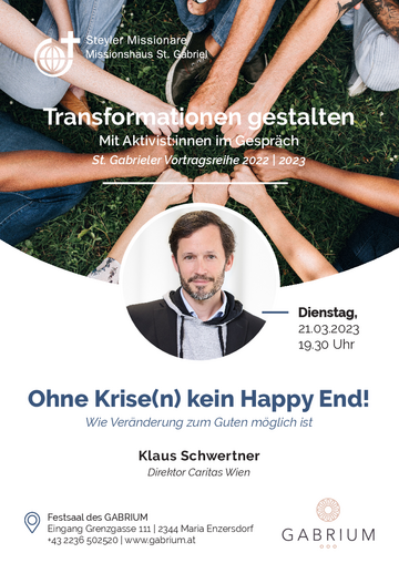 Transformationen gestalten Mit Aktivist:innen im Gespräch St. Gabrieler Vortragsreihe 2022 | 2023 Dienstag, 21.03.2023 19.30 Uhr Ohne Krise(n) kein Happy End! Wie Veränderung zum Guten möglich ist Klaus Schwertner Direktor Caritas Wien Festsaal…