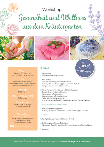 Workshop Wann: Samstag, 03. Juni 2023 von 10:00 bis ca. 14:00 Uhr Wo: Missionspriesterseminar Steyler Missionare Sankt Augustin, Arnold-Janssen-Straße 32 Beitrag: 19,50 € p. P. Max. Teilnehmerzahl: 10 Personen Dozentinnen: Birgitt…
