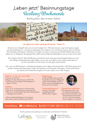 ‚Leben jetzt‘ Besinnungstage Resilienz Wochenende Kraftquellen des inneren Selbst „Du gibst mir meine Lebenskraft zurück.“ Psalm 23 Resilienz ist ein Begriff, den man immer häufiger hört. Oftmals können wir gar nicht genau sagen, was das überhaupt…