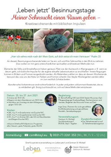 ‚Leben jetzt‘ Besinnungstage Meiner Sehnsucht einen Raum geben – Kreativwochenende mit biblischen Impulsen „Herr ich sehne mich nach dir! Mein Gott, auf dich setze ich mein Vertrauen“ Psalm 25 An diesem Besinnungswochenende laden wir Sie ein, sich…