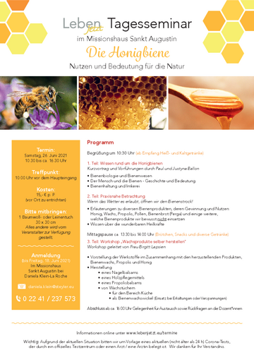 Tagesseminar im Missionshaus Sankt Augustin Die Honigbiene Nutzen und Bedeutung für die Natur Programm Termin: Begrüßung um 10:30 Uhr (ab Empfang Heiß- und Kaltgetränke) Samstag, 26. Juni 2021 10:30 bis ca. 16:30 Uhr Treffpunkt: 1. Teil:…